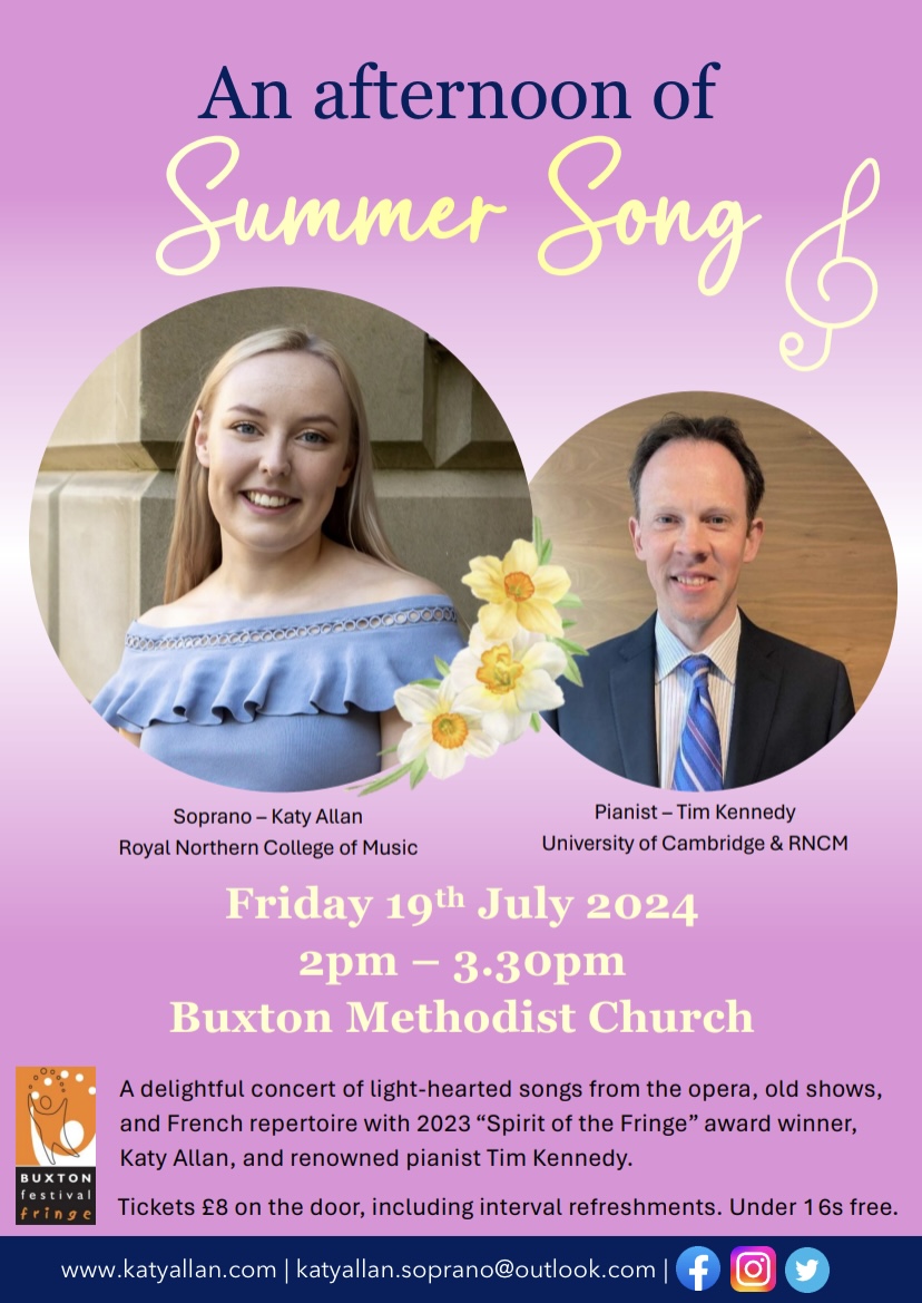 The 2023 Spirit of the Fringe Award-winning soprano, Katy Allan, brings a delightful afternoon concert to this year’s Fringe. Featuring light-hearted operatic arias (Puccini, Mozart), romantic French melodies (Debussy, Fauré), and old show tunes (Rogers & Hammerstein, Lerner & Loewe). Katy will sing alongside renowned pianist Tim Kennedy.