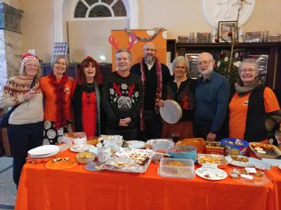Picture shows Fringe team members including Fringe Chair Stephen Walker (with tinsel) and Kaleidoscope Choir’s Carol Bowns (holding tambourine) next to Ian Bowns (in blue).