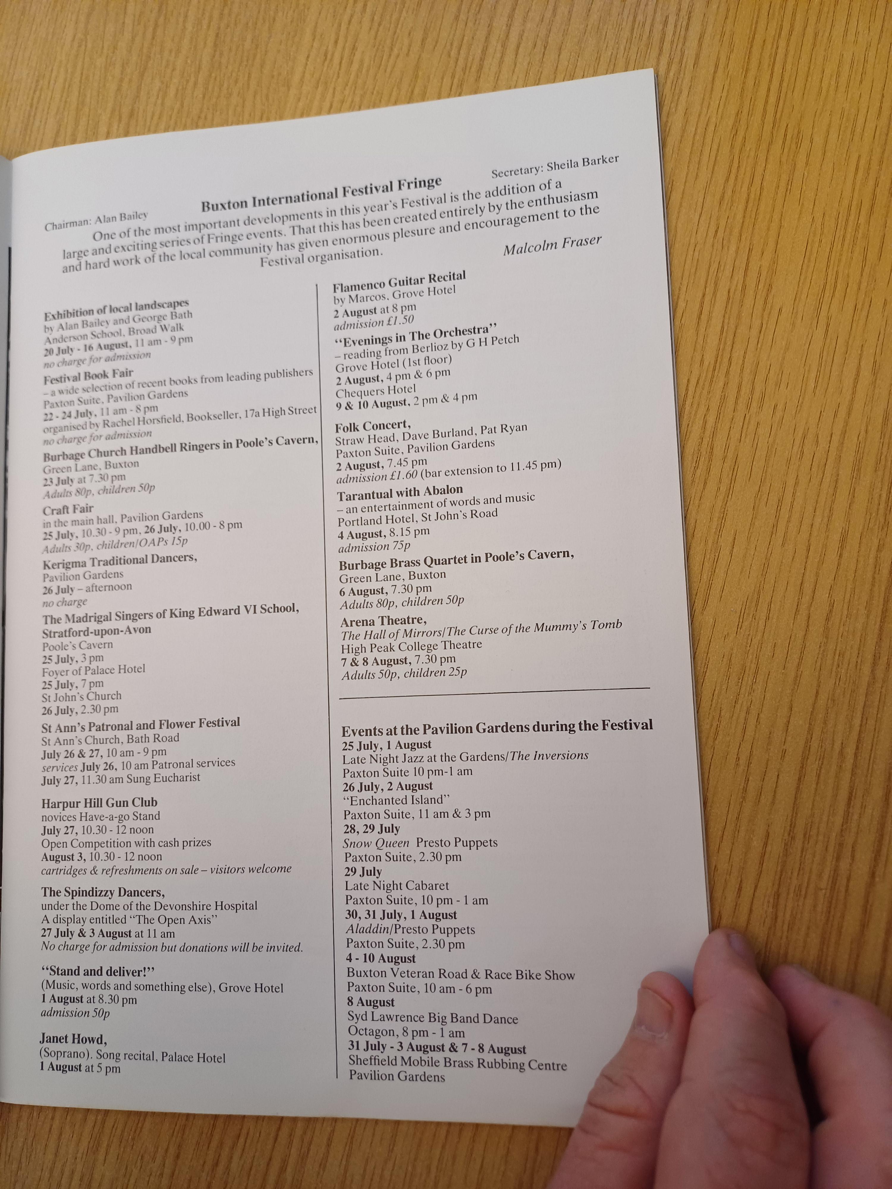 Sketch group Edward the Deckchair arrive in Buxton. They become firm favourites coming back every year until 1990. Comedian Vladimir McTavish makes his debut on the Fringe. He is to reappear in a different guise as football manager Bob Doolally in 2001. Arthur Dickinson takes over as Fringe chair.