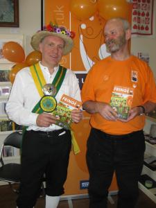 The Fringe 2014 programme was launched in grand style at The Green Man Gallery on Friday June 6 with performers and friends making it a special occasion. Picture shows Chapel-en-le-Frith Morris Man Squire, Graham Kennett, and Fringe chair Keith Savage. With thanks to music providers the Basin Street Jazz Band and staff at the gallery. The programme is being widely distributed in Buxton and beyond and events can also be seen online at www.buxtonfringe.org.uk