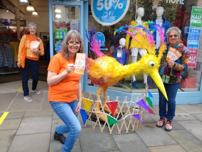 Buxton Festival Fringe looked set to be a soaring success after organisers announced a whopping 100 entries! Fringe Committee member Viv Marriott (behind), Marketing Officer Stephanie Billen, Floella Flap-a-lot from the Sculpture Trail at Buxton Fringe, and Floella's creator, Andrea Lewis, posed outside Hawkshead in Buxton's Spring Gardens to mark the opening day of the Fringe on July 1st. For the Sculpture Trail see http://www.artupclose.org/collaborations/virtual-sculpture-trail-at-buxton-fringe-2020/ Full details of Buxton Fringe events are available on www.buxtonfringe.org.uk and on the free Buxton Fringe App. Photograph by Rob Harrison.